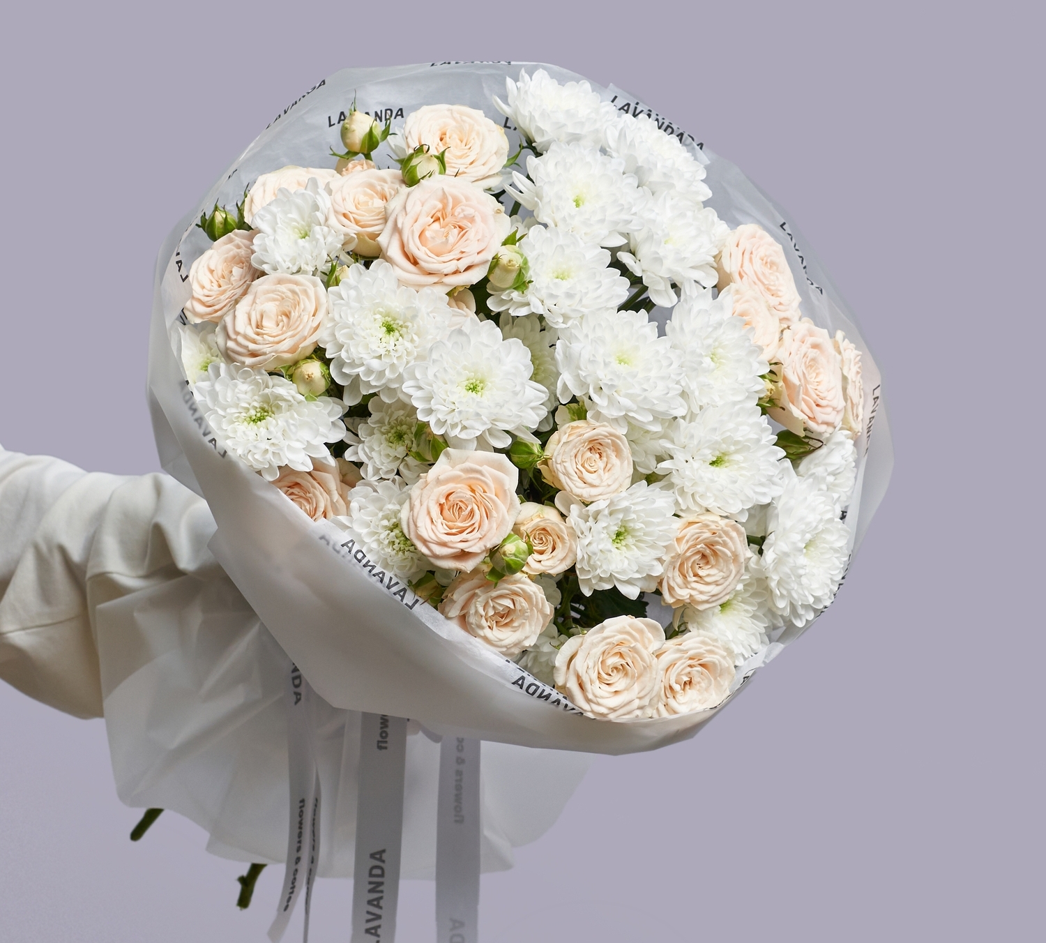 Краткое описание букета: Розу Кения, хризантемы и эустома